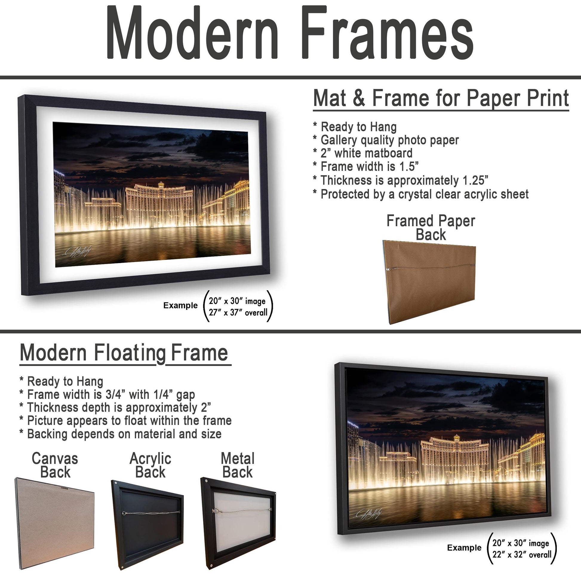 This high-quality Bellagio Fountain Print features precise details from water jets soaring up to 460 feet, synchronized perfectly with music in an 8.5-acre man-made lake. The print is available in multiple formats including premium paper with a 2" white mat border, canvas wrap, acrylic, and metal/aluminum mounted on a floating frame style. Each piece is signed by the artist in the bottom corner, authenticating it as a unique creation that adds personal value to your collection.