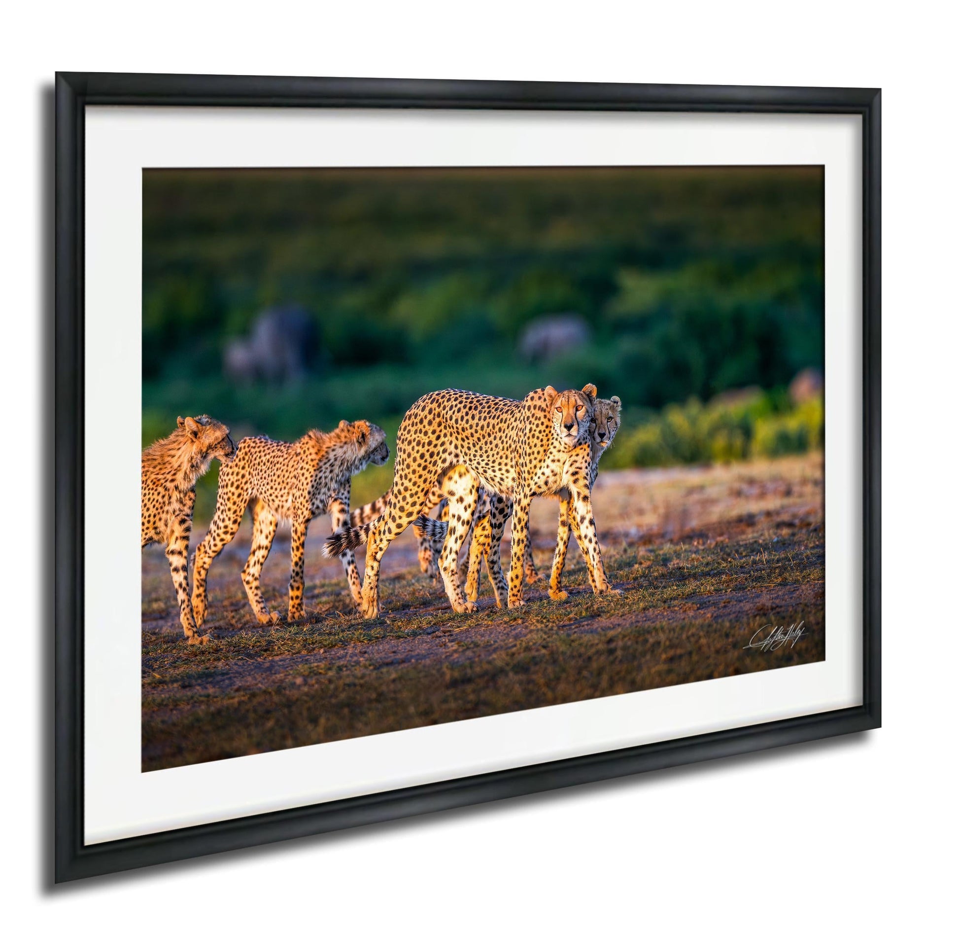 Each framed cheetah print is custom-made with precision, available in multiple sizes and formats including canvas animal artwork, aluminum metal print, acrylics, and flush-mounted options. The high-quality materials ensure durability and long-lasting color vibrancy to keep your safari-inspired decor looking fresh for years. Our prints feature the artist's signature for authenticity and come with a 2" white mat border on framed paper prints for an elegant finish.