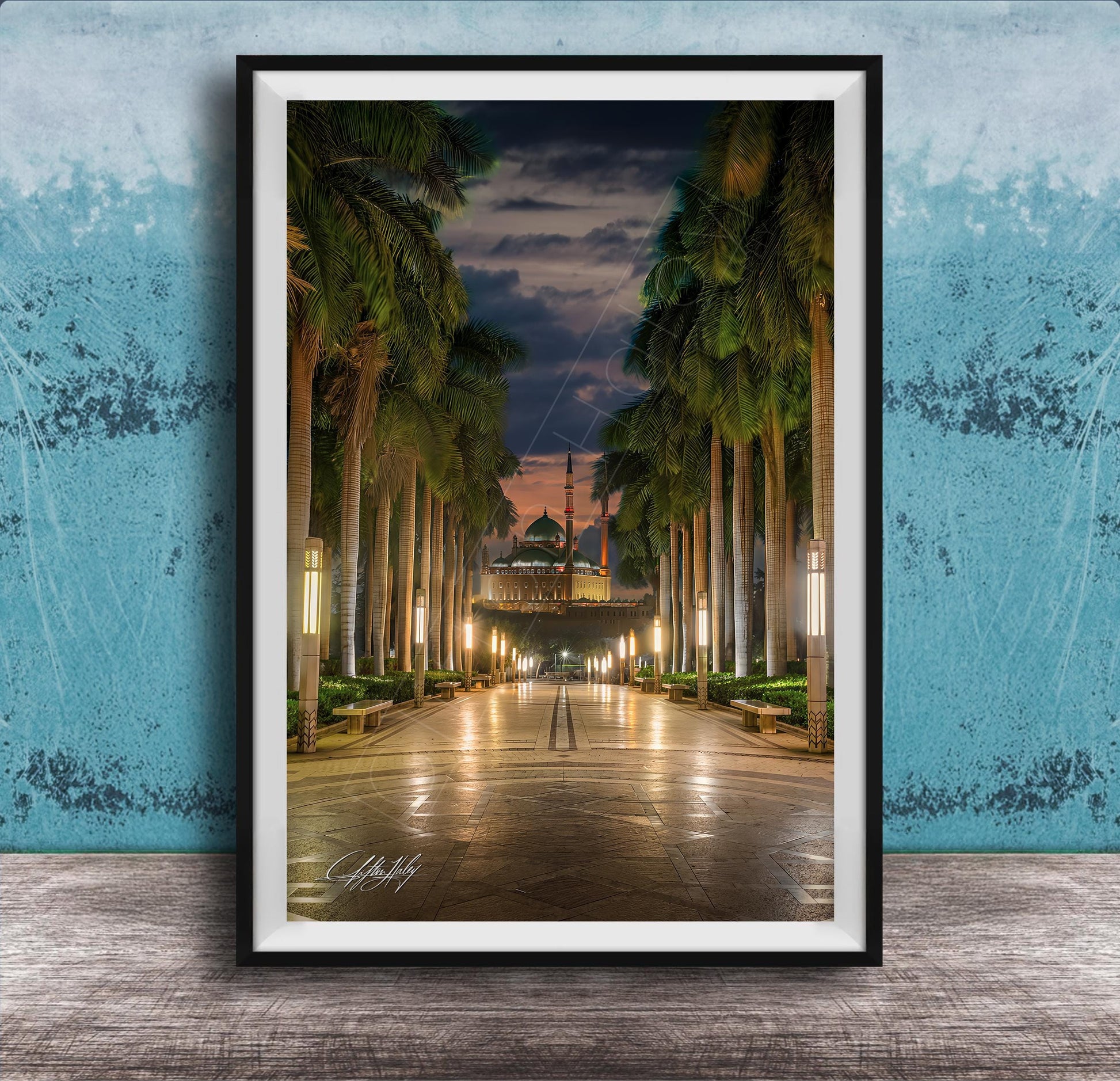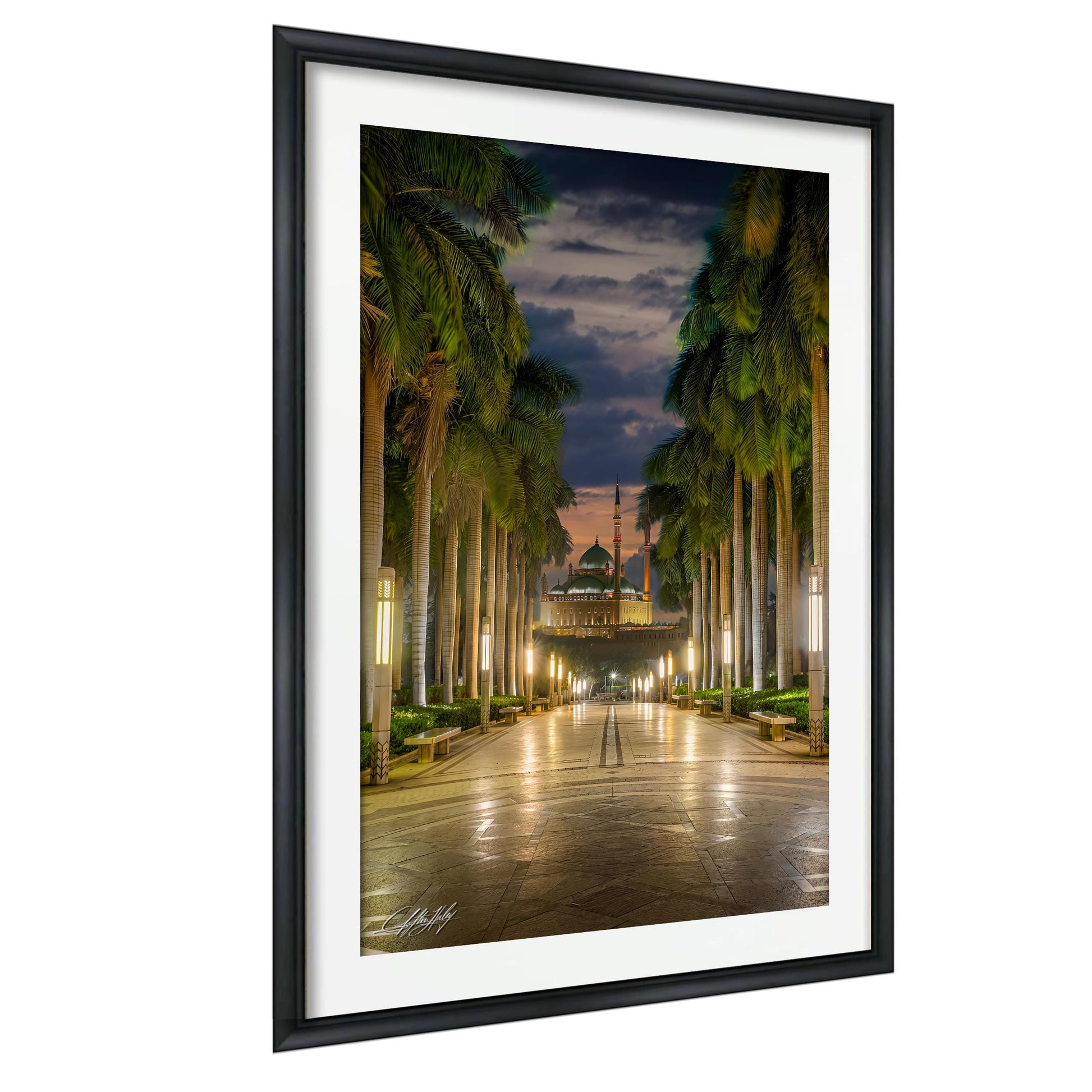 This fine art photography offers more than decoration; it invites viewers into a moment where light, structure, and history converge. The Muhammad Ali Mosque’s calm authority anchors the composition while the Citadel of Cairo completes the scene with enduring strength. Al-Azhar Park’s palm-lined paths add depth and natural contrast to this collector signed print.