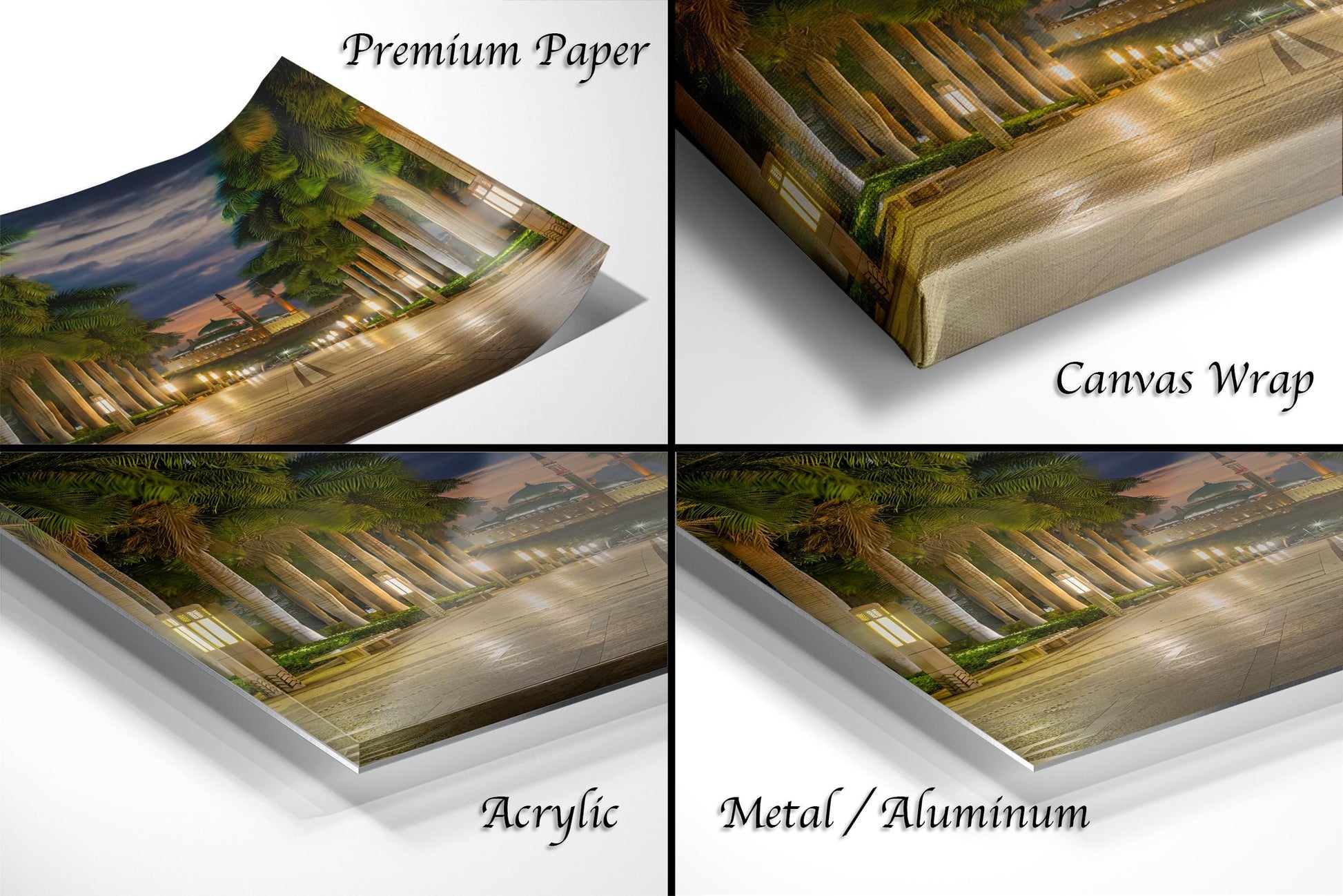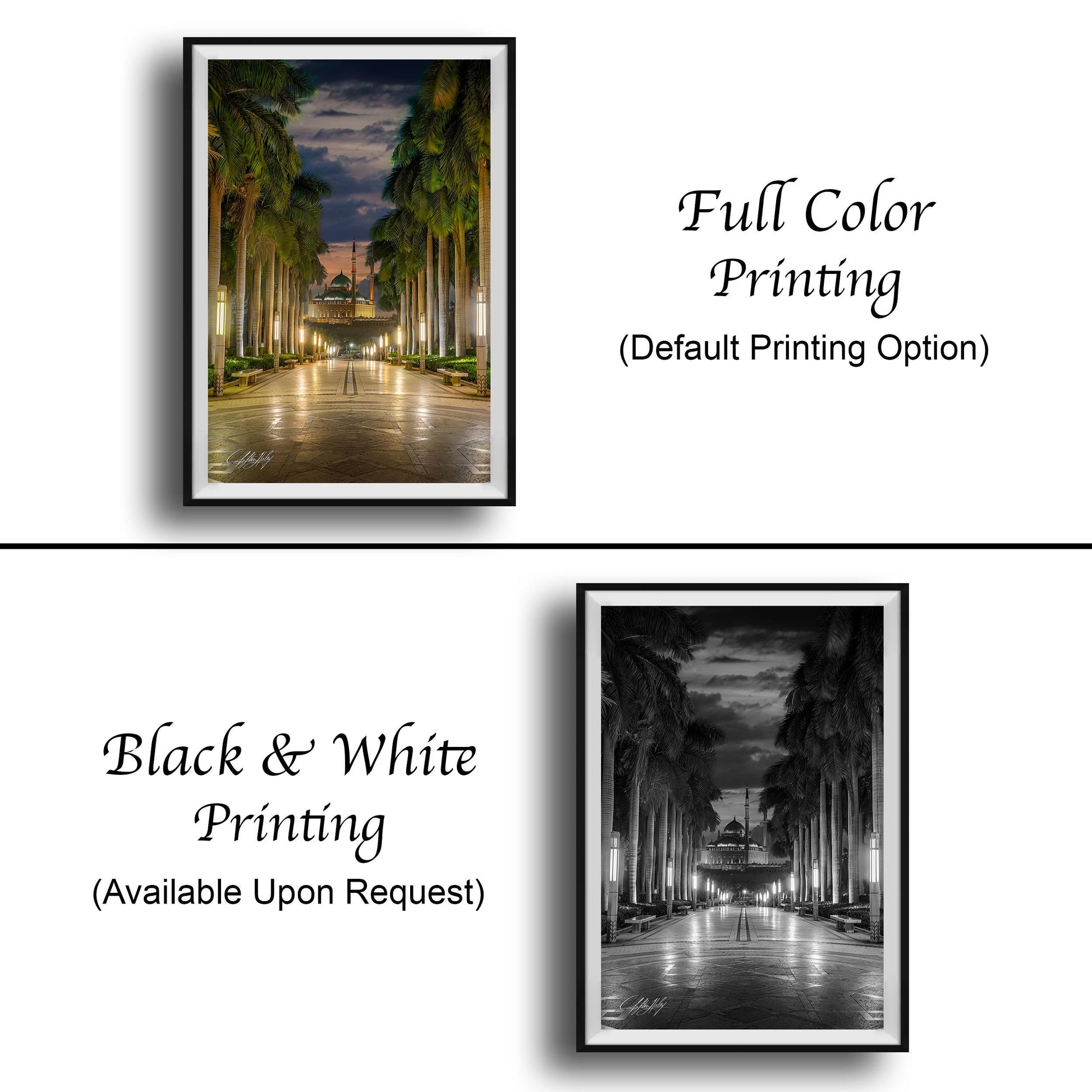 Crafted with attention to detail, this sunset mosque photo measures [insert precise dimensions], printed on premium archival paper or canvas to ensure lasting vibrancy. The floating frame print option enhances its presence on any wall, while the framed paper print includes a 2" white mat border for refined presentation. Each collector signed print bears the artist’s signature in the bottom corner, authenticating its uniqueness and adding personal value.