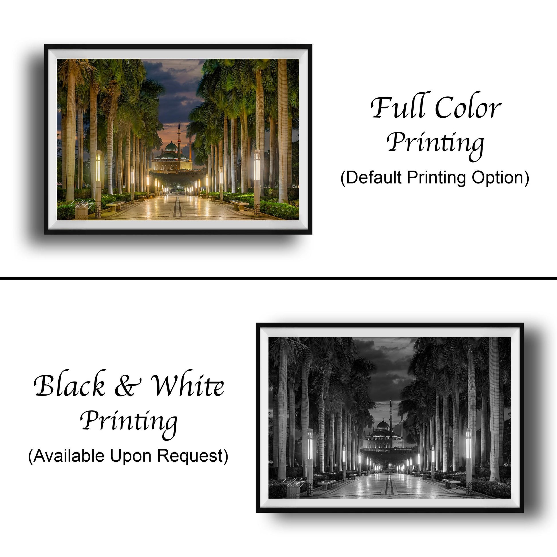 This Muhammad Ali Mosque print measures precisely to highlight every detail, printed on premium archival paper or canvas to ensure vivid colors and lasting quality. The floating frame print option adds a modern touch that enhances the architectural symmetry art, while the artist signed print authenticates each piece as a unique creation. This historical mosque wall art serves as a refined statement of place and perspective, ideal for those seeking sunset cityscape decor with depth and meaning.