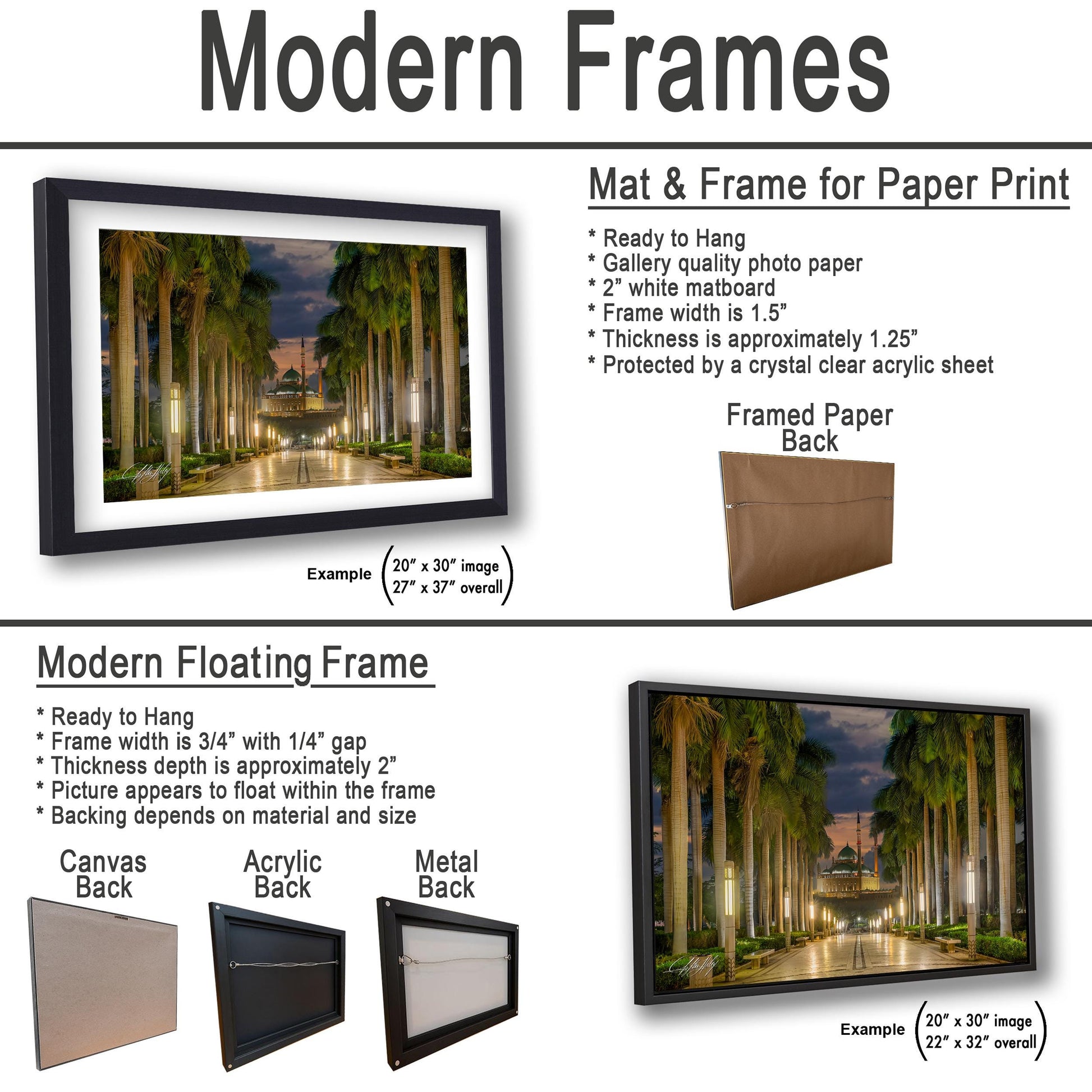 - Choice of framing options: floating frame for canvas, acrylic, and metal prints; 2" white mat border for framed paper prints